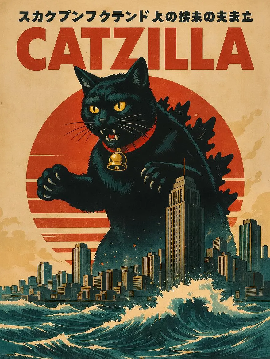 Generate a retro Japanese kaiju movie poster featuring CATZILLA – a colossal black cat with glowing yellow eyes and red collar wreaking havoc on a cityscape. Dynamic comic book style showcases crashing waves, a red sun, katakana text, and a vivid red/beige/black/teal color palette. Perfect AI art homage to vintage monster films.