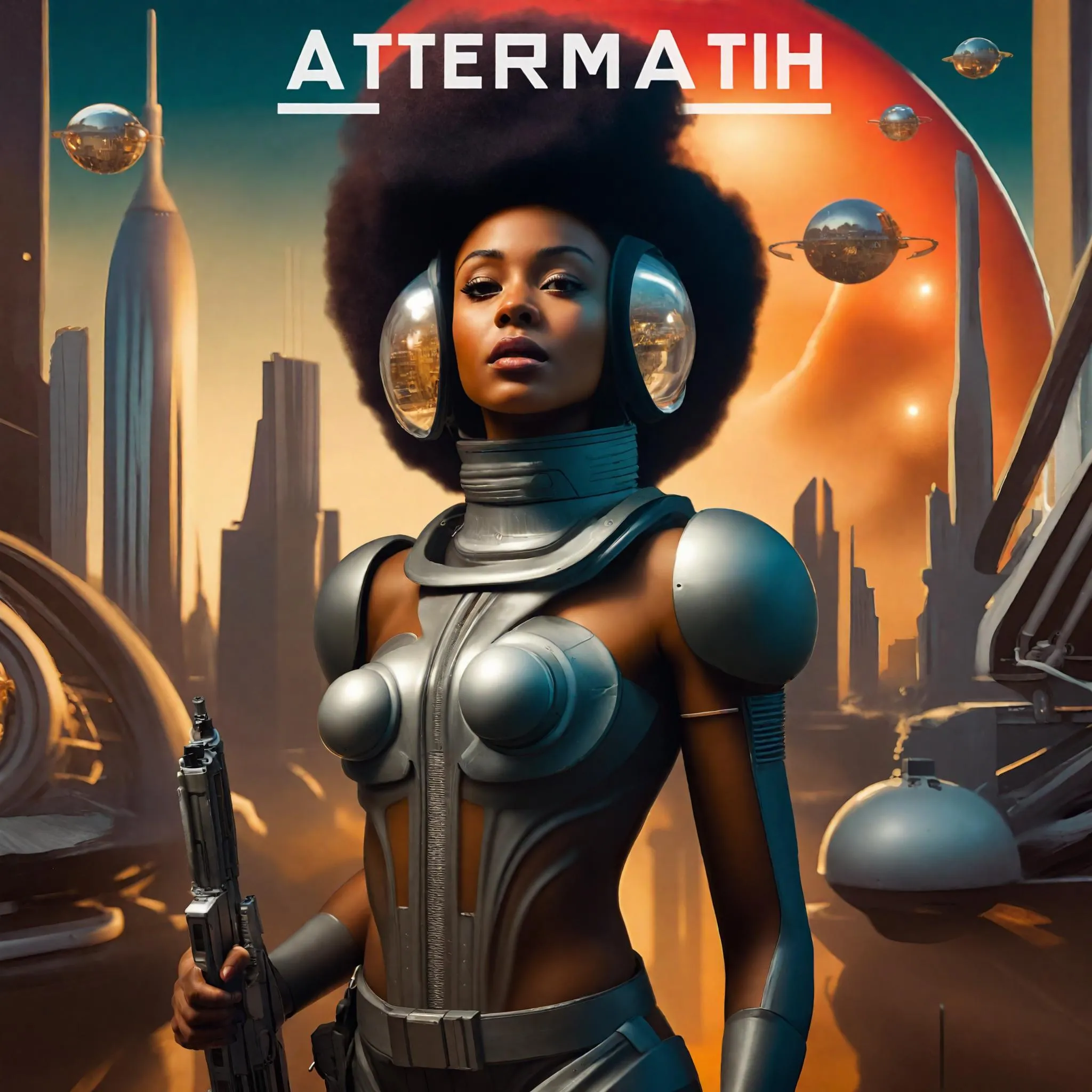 A beautiful Black woman, wearing a clear space helmet, displaying her natural hair.  She is also wearing a shapely, futuristic space suit on her torso.  The setting is a futuristic city under attack.  She bravely posses with her weapon ready for action!  Thank you!
