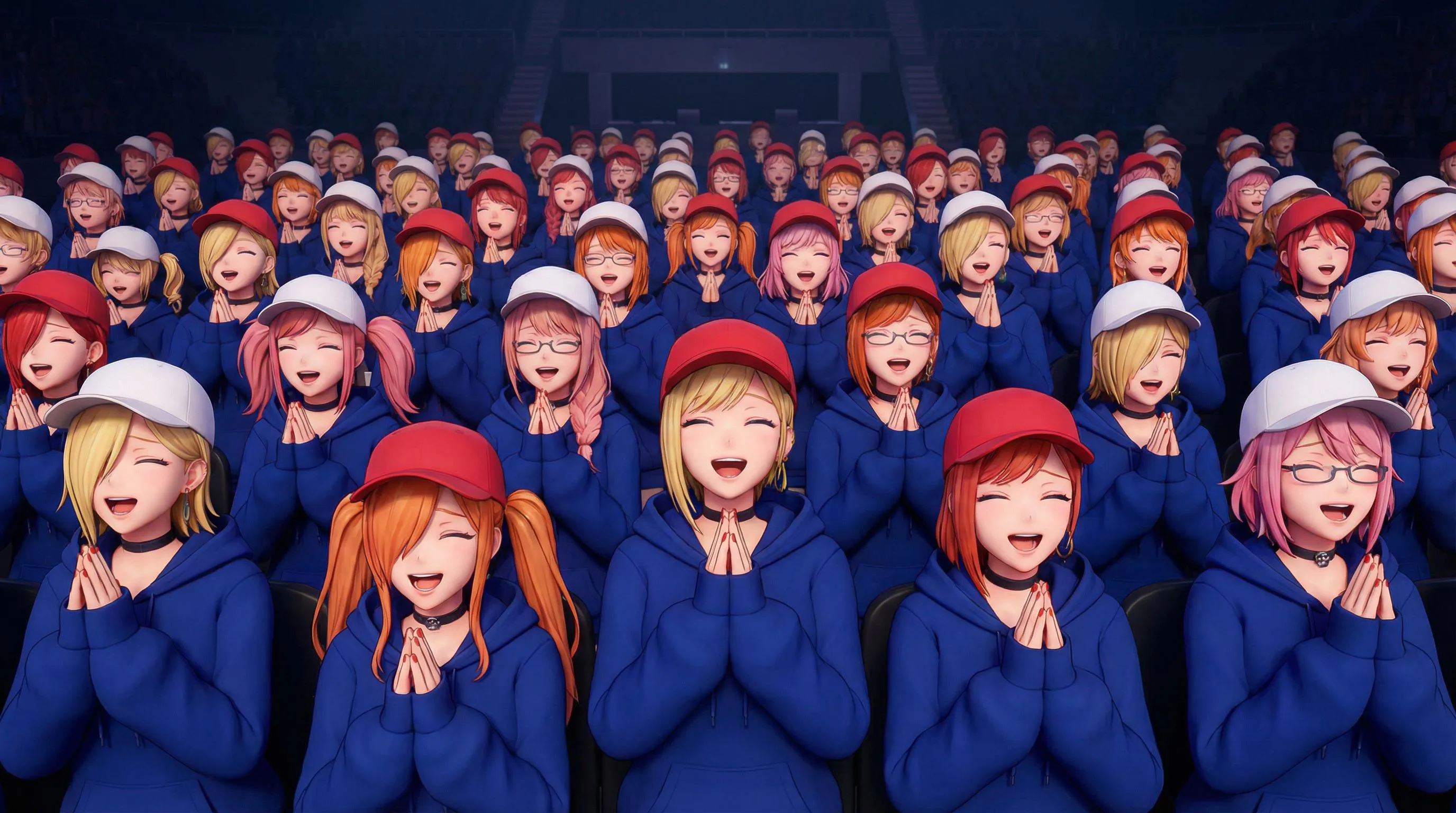Create anime-inspired CGI crowds with Final Fantasy hairstyles in deep blue hoodies featuring moe sleeves hiding praying hands. Vibrant accessories like baseball hats, chokers, and colored nails. Generate diverse characters with elated expressions, side-swept hair, and unique sleeve styles using this AI image generator for vivid fan art scenes.