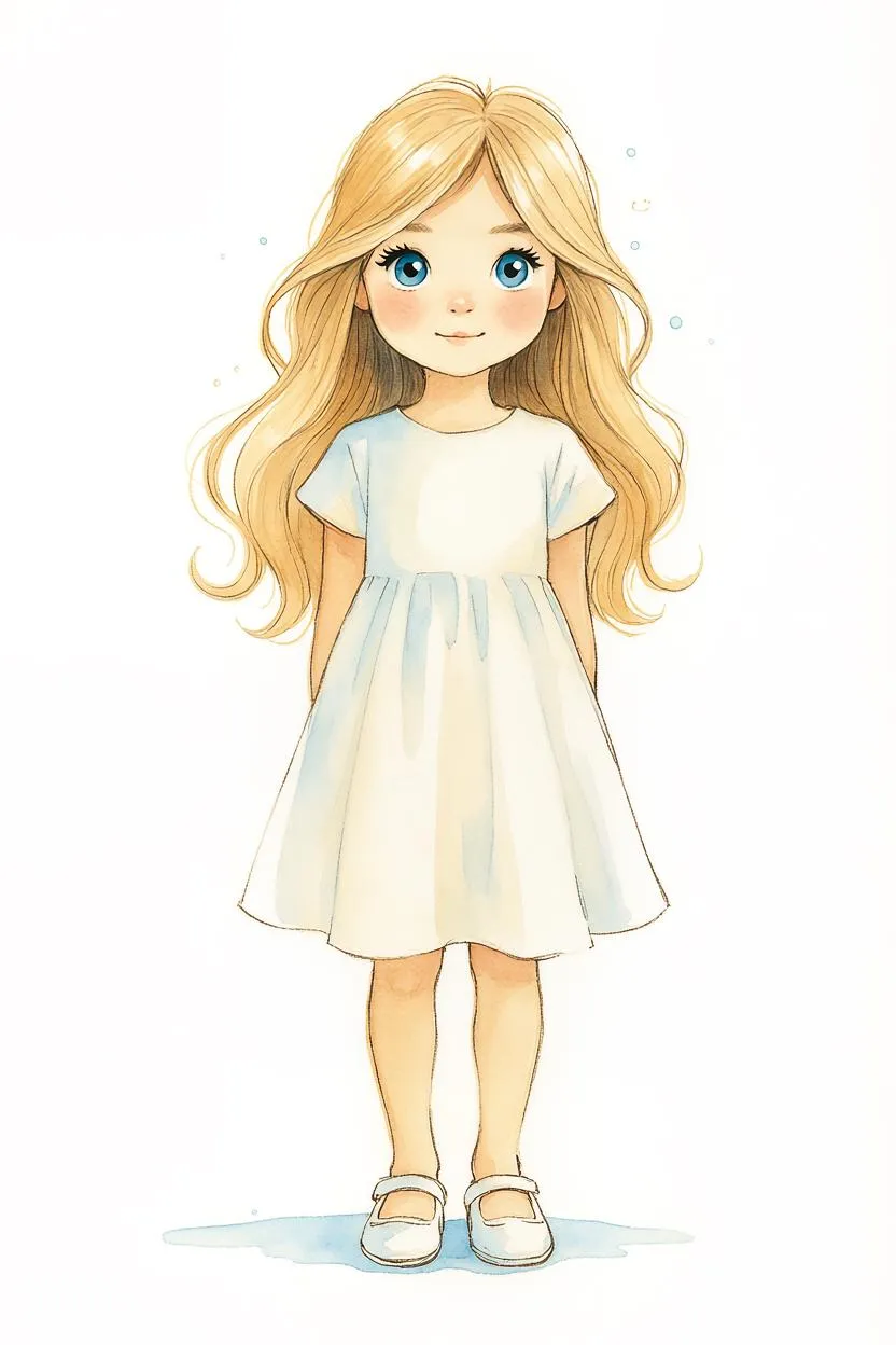 An 8-year-old girl with long, wavy blonde hair and bright blue eyes stands front-facing in a relaxed, curious posture. She wears a simple, flowing white dress and matching small shoes. Set against a clean white background, the illustration is rendered in Quentin Blake’s whimsical style, featuring loose ink lines, playful proportions, and delicate watercolor washes. Subtle splashes of pale blues and warm yellows add movement and life, radiating innocence and charm.