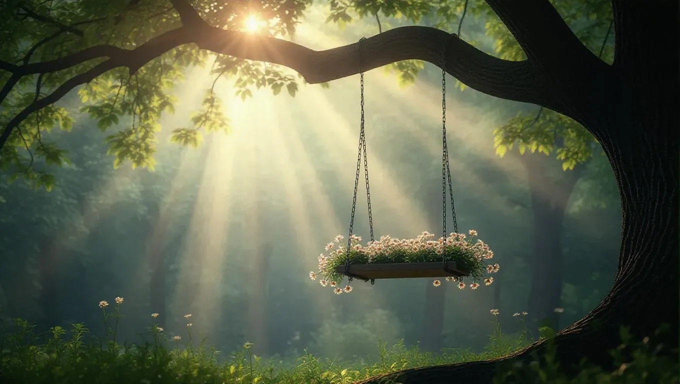 A swing adorned with flowers, hanging from a solitary oak tree, suspended above a misty forest, capturing a mystical and enchanting mood, with dappled sunlight filtering through, casting intricate shadows and enhancing the fairytale atmosphere