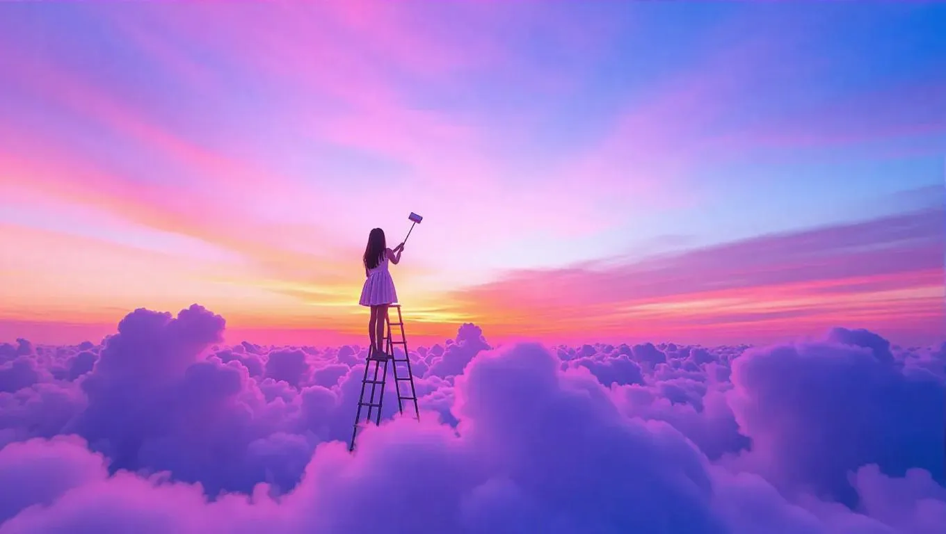 Text to ImageA girl standing on a ladder resting on a silky cloud, energetically painting the sky with each stroke, transforming the colors of the sunset into a mesmerizing blend of soft pastels, capturing the magic of twilightRecreate