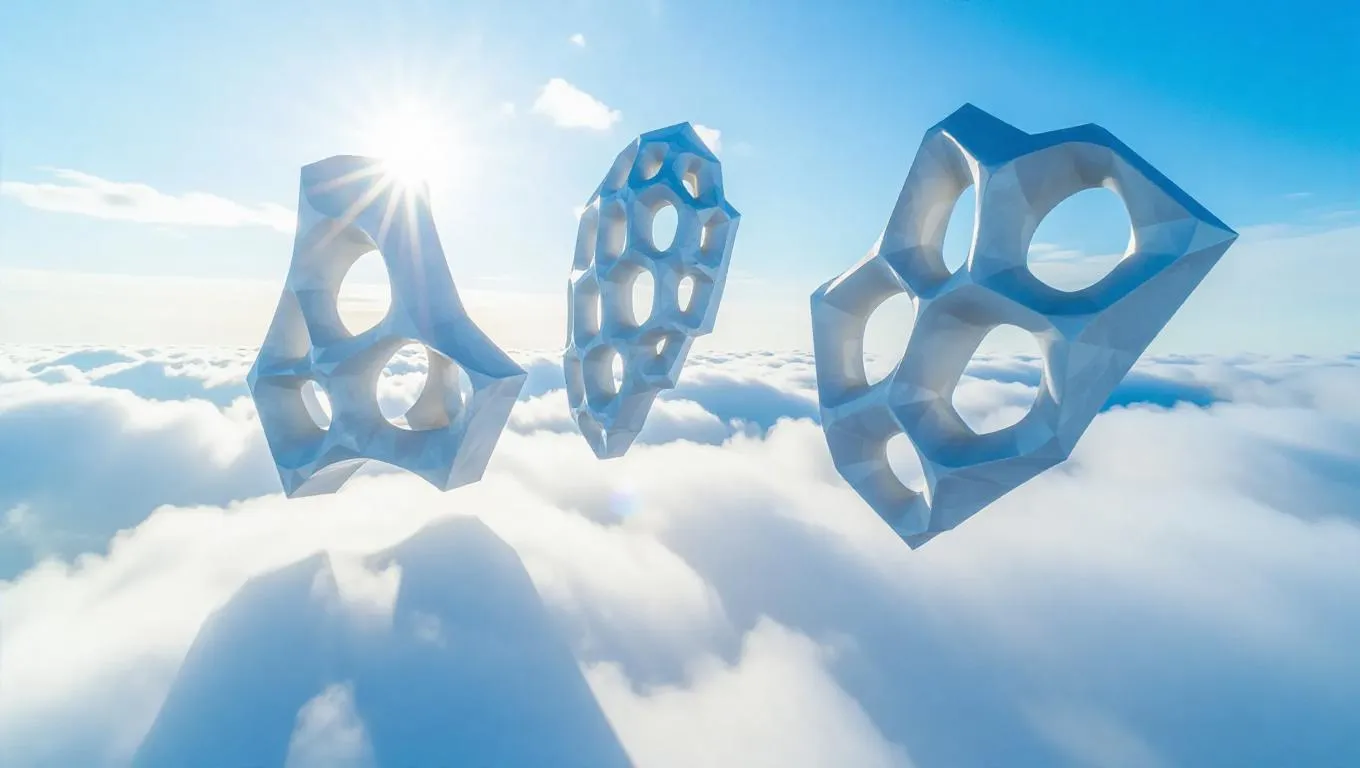 The sculptures are made of a special lightweight material that can float on the clouds. They are designed in various shapes, such as animals, plants, or abstract geometric figures. These sculptures seem to be suspended in mid - air, creating a mysterious and dreamy atmosphere. The sunlight shines through them, casting beautiful shadows on the clouds below.