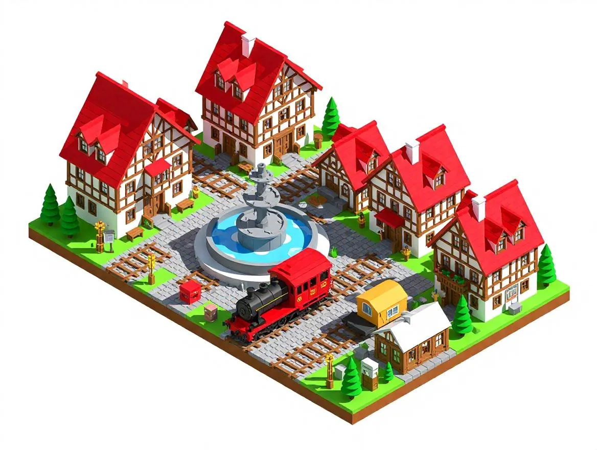Generate a detailed isometric steampunk cityscape with Bavarian-style houses, an ornate fountain, vintage railroad station, and intricate brick flooring using vivago.ai. Transform your AI art vision into professional visuals with our advanced image generator tool for unique steampunk world-building.