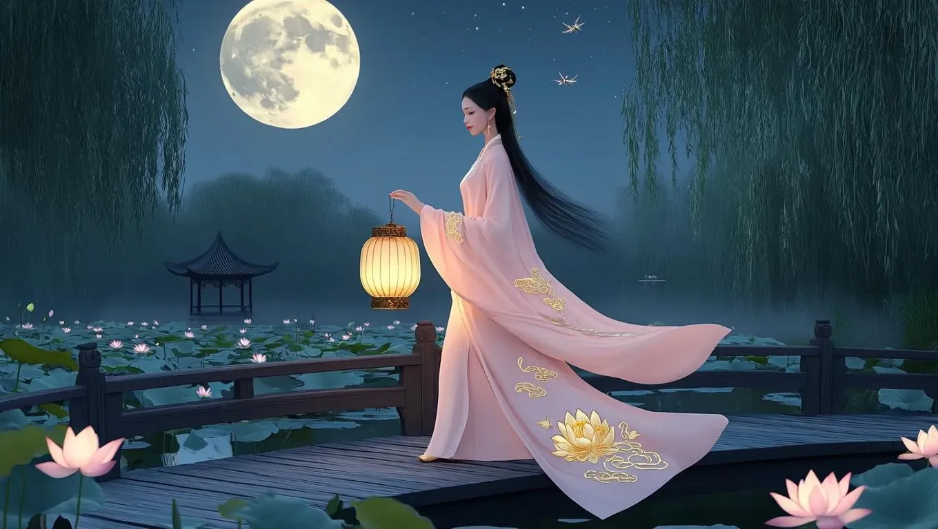 Experience a serene ancient Chinese scene: a graceful lady in embroidered pink ruqun strolls a moonlit lotus pond bridge, silk lantern glowing. Reflective waters showcase blooming lotuses, dragonflies, and starry skies. Misty willows and pavilion blend Big Fish & Begonia elegance with Makoto Shinkai’s hues. Create dreamy, painterly Chinese anime visuals with vivago.ai’s AI image tools. #AncientChineseStyle