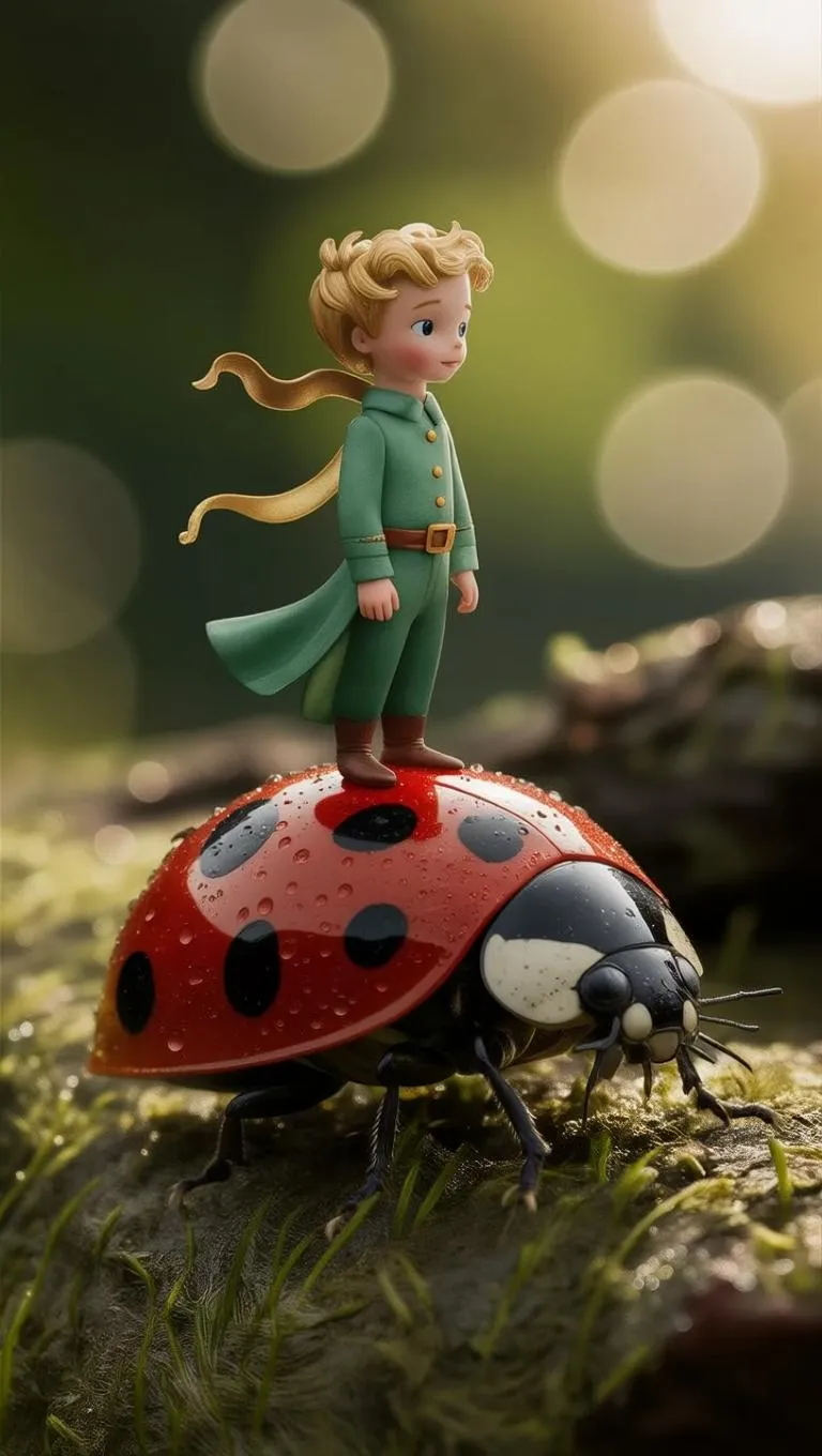 A hyper-realistic photograph of *The Little Prince* standing gracefully on the curved red back of a ladybug. The ladybug's glossy shell, dotted with deep black spots, glistens under soft natural light. The prince, in his classic green attire, has golden hair tousled by a gentle breeze as he gazes thoughtfully at the horizon. The macro perspective captures stunning details: tiny leg hairs, dew droplets on the bug’s shell, and blurred mossy textures beneath. The background is a soft bokeh of sunlit greens, evoking wonder and poetic surrealism.