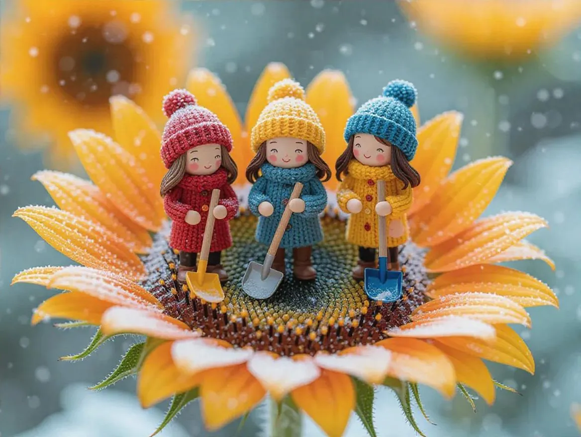 Experience AI-generated miniature winter scenes with cozy figures clearing snow from a frosty sunflower. This magical wonderland art blends intricate natural details with warmth and compassion. Create unique winter vistas using vivago.ai's AI art tool for stunning visual creation.