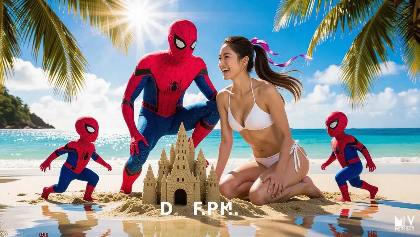 A sun-drenched tropical beach frames Spider-Man standing protectively beside his radiant Japanese wife, her athletic frame showcased in a sleek white bikini as she kneels before an elaborate sandcastle. Midday light glints off her ribbon-adorned ponytail, swinging above toned shoulders, captured mid-laugh over her shoulder. Two toddlers in miniature spider-suits dart across wet sand, while towering palm fronds frame crystalline waters where sunlight fractures into diamond-like sparkles. Ultra-high definition captures individual grains of golden sand, ocean breeze through swaying coconut trees, and pearlescent droplets on the children's crimson costumes, all under vibrant natural lighting.