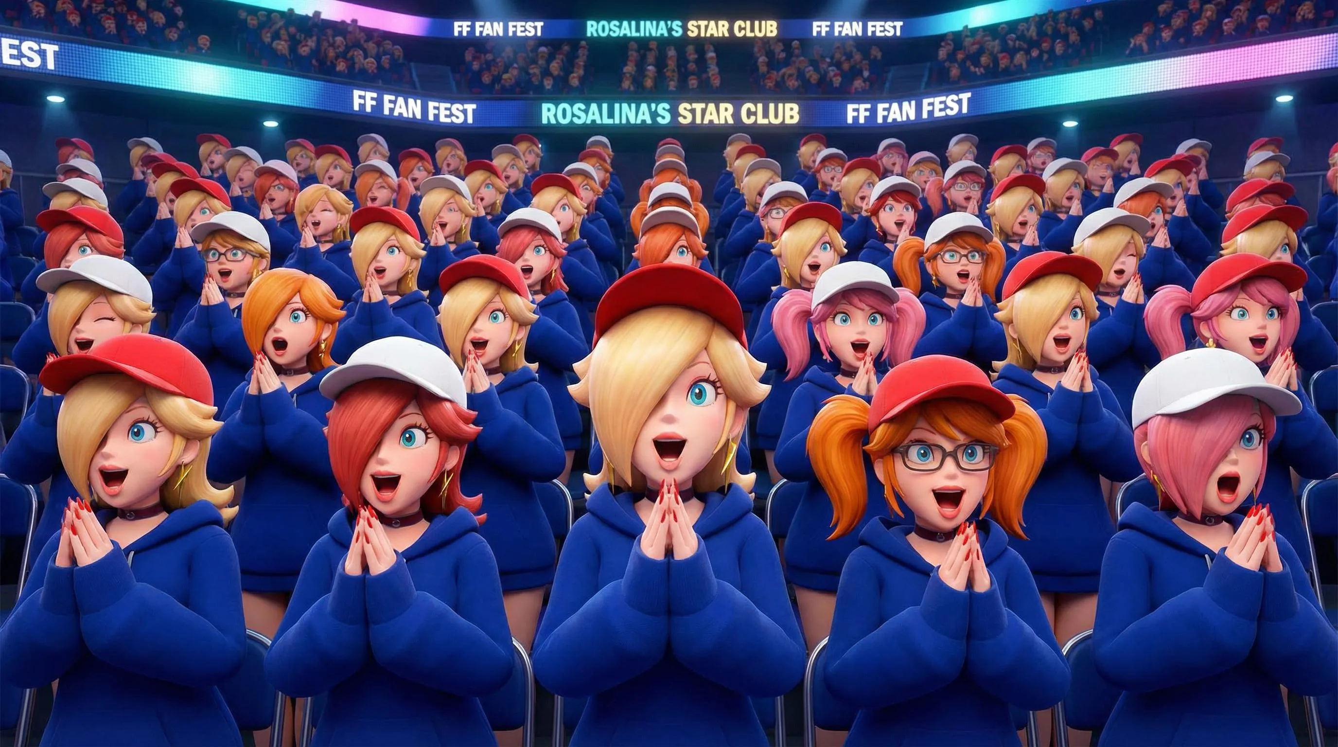 Generate lively CGI anime women inspired by Final Fantasy with vibrant multicolored hair & side-swept styles. Adorned in deep blue moe-sleeve hoodies hiding hands, red/white hats, chokers, skirts, & long nails. Capture their elated expressions, admiring prayer pose, & joyful screams in this vibrant digital art scene. Perfect AI anime character creation.