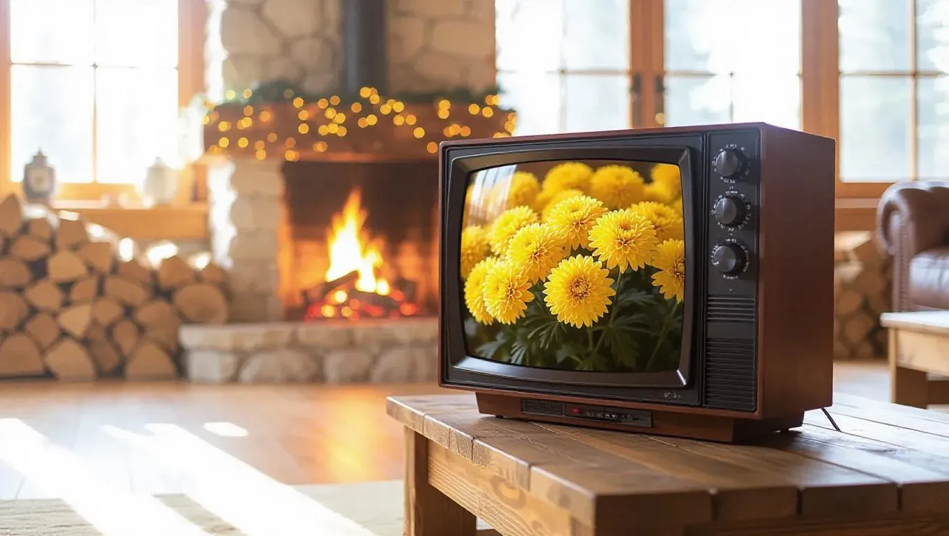 A broken television set nestled in a cozy cabin, its screen glowing faintly, blooming with warm golden chrysanthemums, surrounded by wood logs and the flickering light of a fireplace