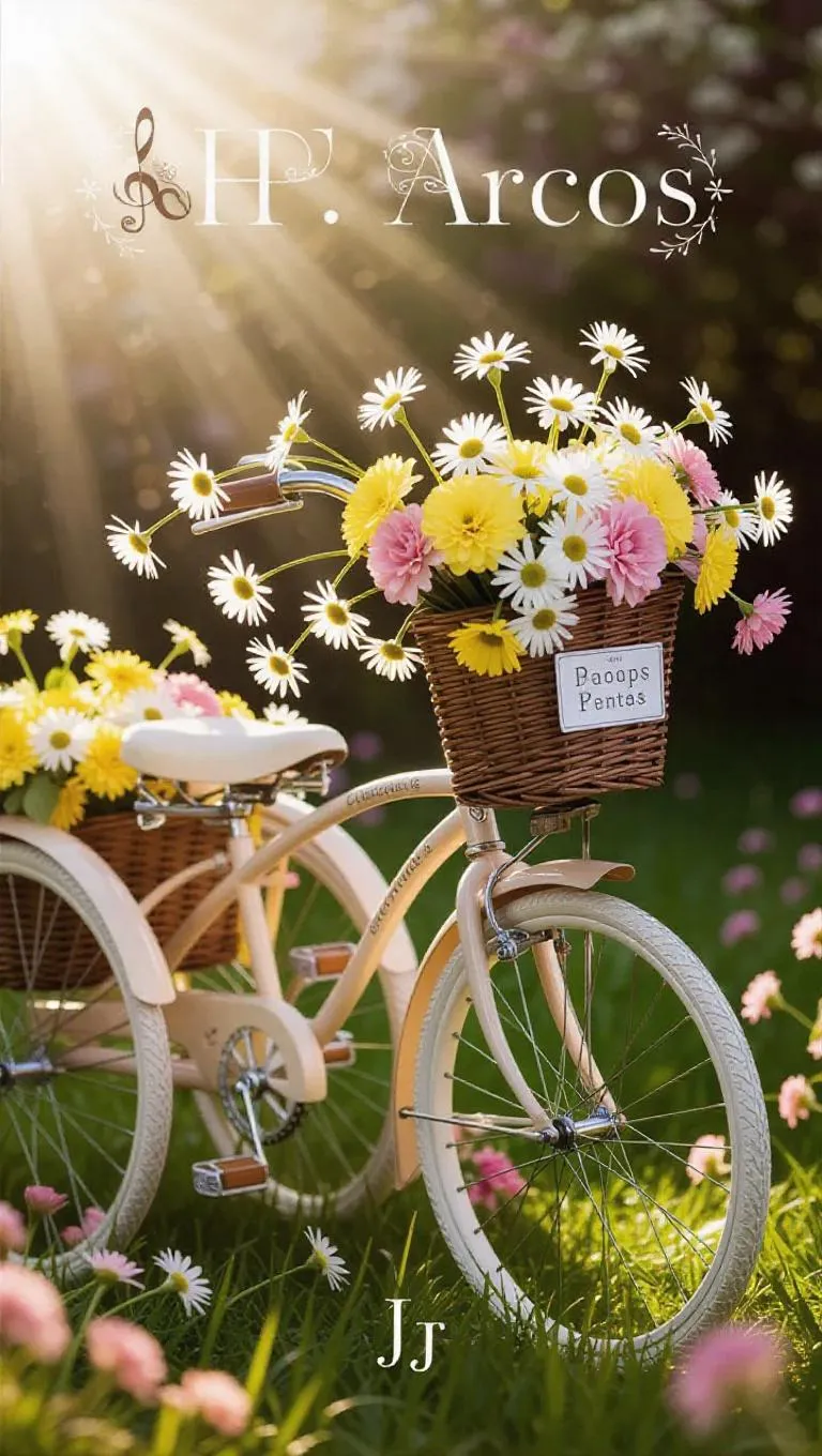 An exquisite, old-fashioned tricycle decorated with buttercups and carnations that seem to be gently touched by the breath of spring. The tricycle’s design is elegantly vintage, with a woven basket at the back filled with fresh, cheerful flowers in shades of yellow, pink, and white. The wheels radiate in the gentle sunlight, reflecting the surrounding beauty. The blossoms sway loosely from the handlebars and frame, creating a picturesque and romantic atmosphere. The scene is set against a soft, blurred background of a sunlit glade, enhancing the focus on the tricycle and its floral embellishments. The entire composition exudes warmth and nostalgia, as if the tricycle is carrying a load of springtime wonder to a distant, idyllic destination. The art style is soft and lyrical, capturing the textures of the flowers, the vintage sheen of the tricycle, and the heartfelt essence of the moment.