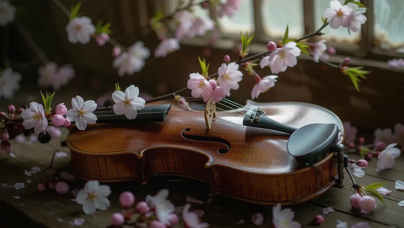 Text to ImageA weathered violin lying in a dimly lit room, its wooden body cracked open, with delicate cherry blossoms sprouting from within, petals gently fluttering in the breeze, creating a surreal and enchanting sceneRecreate
