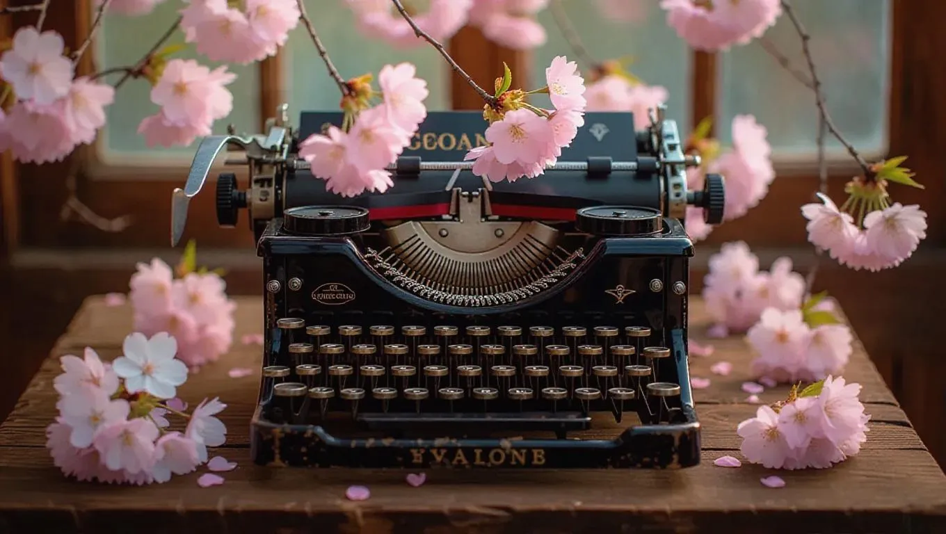 An antique typewriter with ethereal cherry blossoms blooming from the keys and carriage, creating a lovely encounter of vintage charm and natural charm. The typewriter sits on a rough-hewn wooden table, surrounded by gentle, enchanting light filtering through blossoms, enhancing the serene and whimsical atmosphere.
