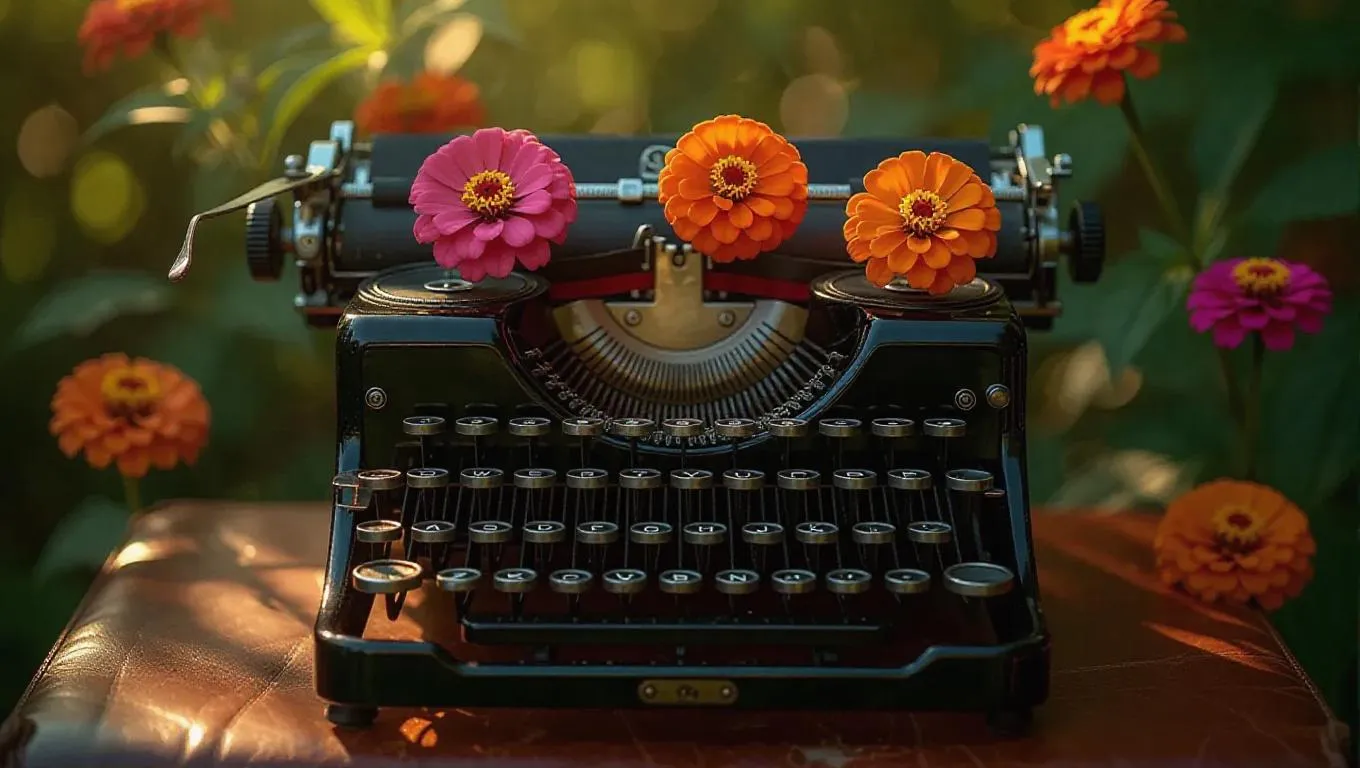An antique typewriter with striking zinnias blossoming from the keys and carriage, creating a bold fusion of vintage charm and natural beauty. The typewriter rests on an old leather surface, surrounded by bright, vibrant sunlight filtering through forest branches, enhancing the lively and magical atmosphere.