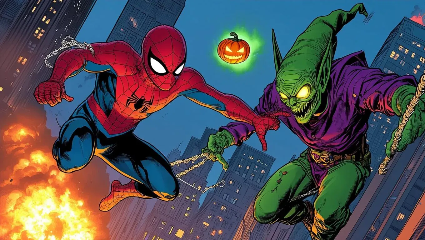 Create dynamic AI-generated artwork of Spider-Man vs Green Goblin in a mid-air battle with explosive comic book action. Transform text prompts into vivid superhero scenes with professional editing tools at VivaGo.ai.