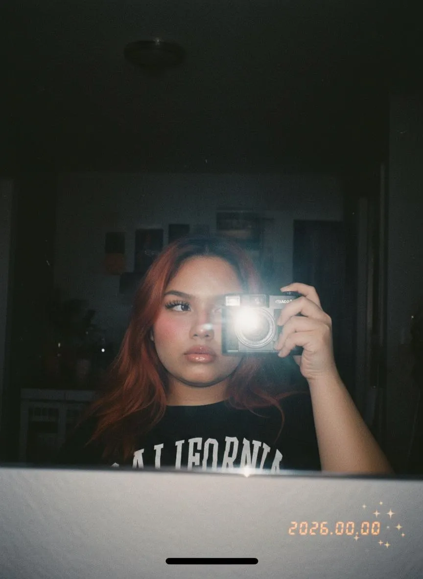 主体 + 妆容:上传的图中人物(面部特征不变),清冷自然的表情,清透的淡淡妆容;拍摄 + 氛围,淡粉色苹果肌腮红,裸粉色唇釉,纤长卷翘假睫毛,自然眉形;手持佳能复古卡片相机自拍,相机闪光灯强光直射镜头(产生明显白色眩光),室内镜子前自拍视角;昏暗日常房间背景(模糊家具装饰),松弛甜酷的摄影写真感,暗调自然色调,胶片摄影感,复古自然的胶片滤镜和胶片燥点;细节点缀:右下角添加橙色数字日期水印(2026.00.00)+ 小星芒装饰