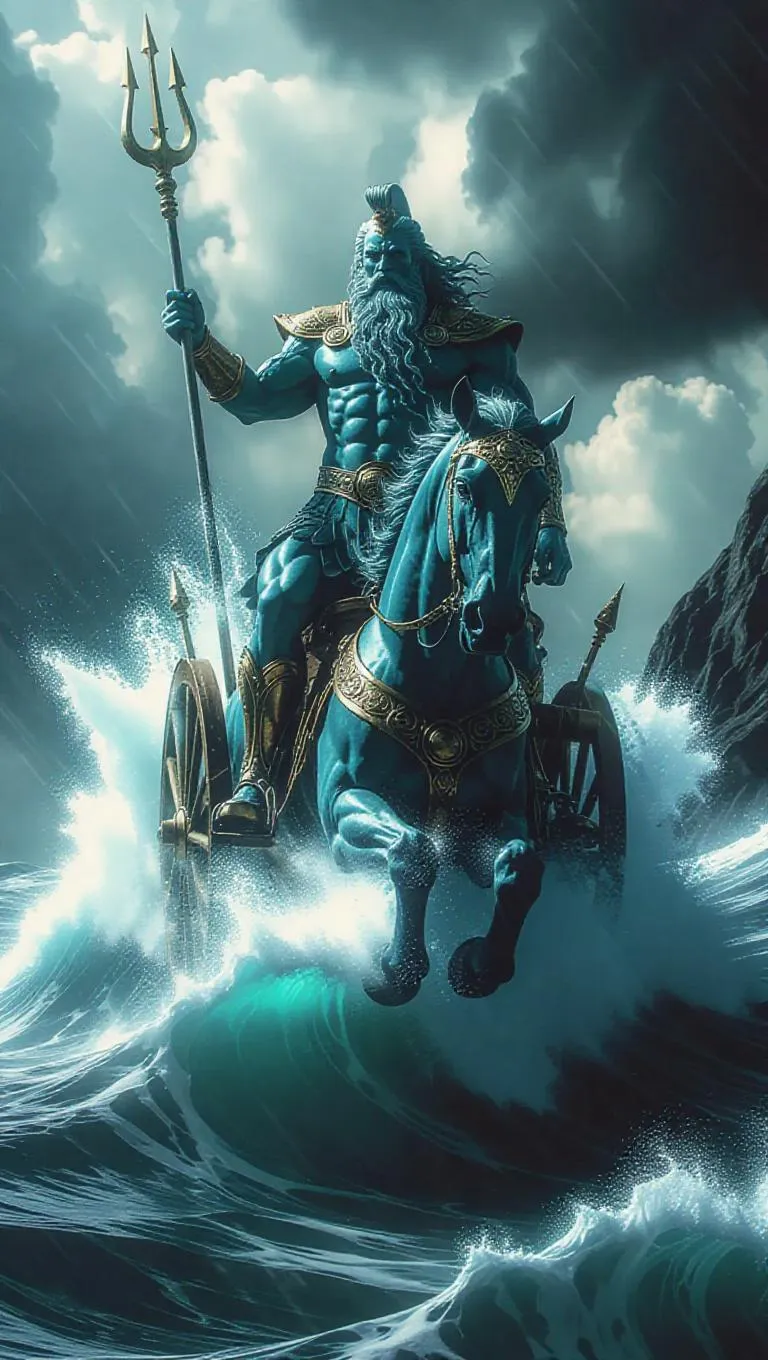 Generate stunning AI art of Poseidon commanding stormy seas with hippocampi-drawn chariots, coral armor, and divine fury. Perfect for mythological visuals, oceanic themes, and epic deity imagery. Create dynamic marine scenes, mythic waves, and godly power with AI-enhanced details. Ideal for digital artists, fantasy projects, and seascape storytelling.