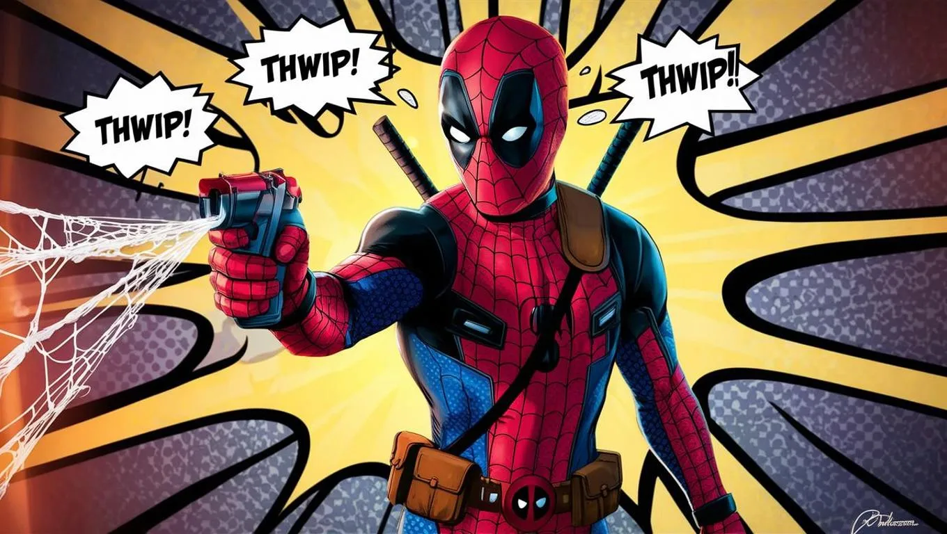 Spider-Man, dressed as Deadpool, stands in a Lichtenstein pop-art explosion, his comic-dot pattern body suit contrasting with the vibrant, dynamic background. He sprays web-fluid, forming speech bubbles that read "THWIP!" His mischievous grin and intense eyes break the fourth wall as he uses web-replica brushes to dismantle it. Soft, warm light highlights his figure, casting dramatic shadows that enhance the playful yet edgy atmosphere. The style is a blend of realistic and comic book aesthetics, capturing the essence of both characters.