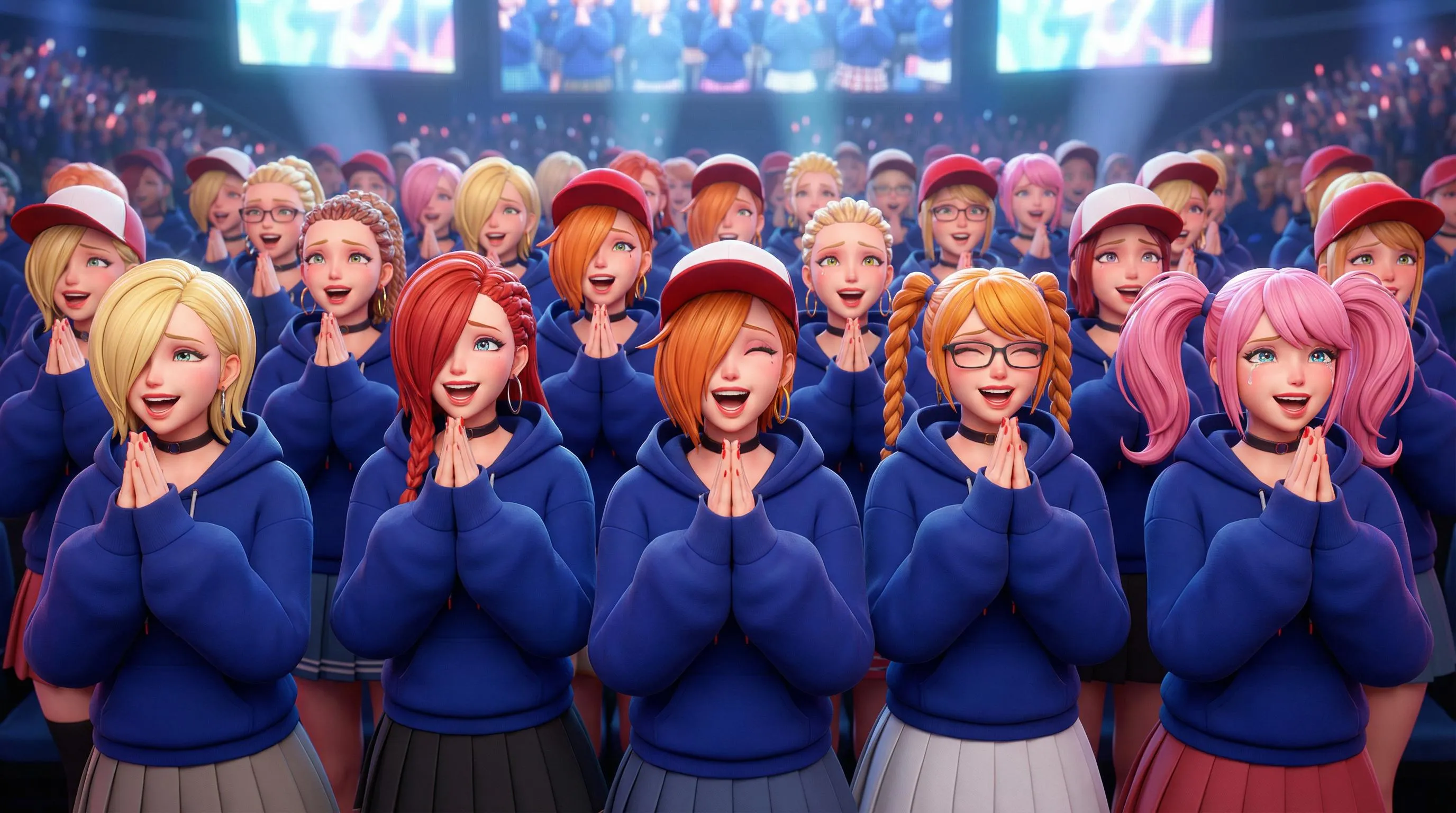 Generate lively CGI anime women inspired by Final Fantasy with vibrant multicolored hair & side-swept styles. Adorned in deep blue moe-sleeve hoodies hiding hands, red/white hats, chokers, skirts, & long nails. Capture their elated expressions, admiring prayer pose, & joyful screams in this vibrant digital art scene. Perfect AI anime character creation.
