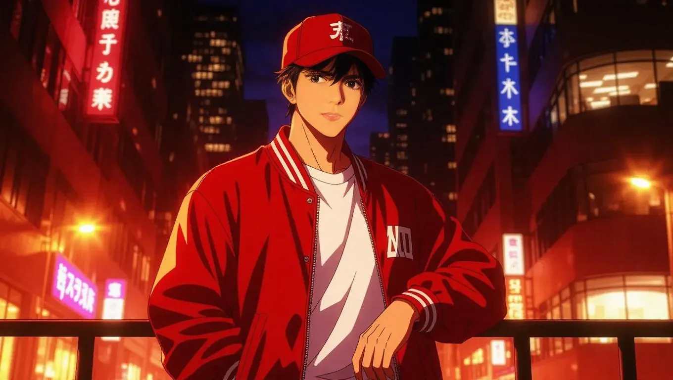 Generate a bold anime-style male character in a vibrant city night scene with AI. Features a red-and-white baseball jacket, red cap with white text, and confident stance against detailed buildings bathed in warm ambient lights. Clean lines, classic anime shading, and dynamic color contrasts create professional-grade visuals for anime enthusiasts and digital creators. Elevate storytelling with vivid AI-generated artistry.