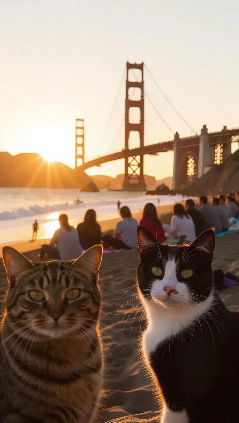 A sunset scene at Baker Beach in San Francisco, with the Golden Gate Bridge prominently in the background. The beach is populated with people sitting and enjoying the view, bathed in warm, golden light. In the foreground, two cats—one tabby and one black-and-white—are out of focus and close to the camera, adding a whimsical, surreal touch. The mood is spontaneous and charming, with a selfie POV capturing the candid moment.