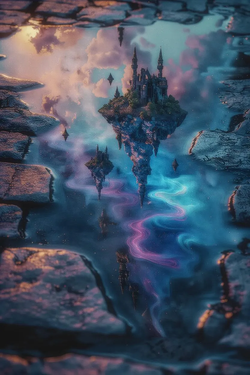 Puddles on the cobblestone streets reflect a surreal, otherworldly sky above. The water's surface captures the distorted, glowing hues of floating islands and mysterious structures, blending fantasy with the real world. Vibrant colors swirl in the reflections, creating a stark contrast with the gritty, textured pavement beneath. The sky above appears vast and dreamlike, with soft clouds melting into celestial formations. The entire scene exudes a sense of eerie calm, inviting the viewer into a dreamscape of unexpected beauty, framed by the fine details of the street's weathered texture and the soft glow of twilight.