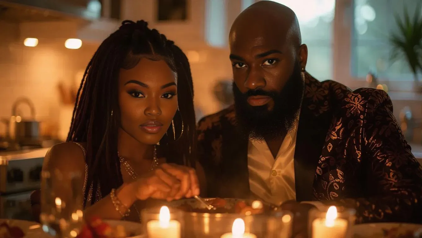 Create AI-generated visuals of a romantic candlelight dinner scene with a bald Black man in a silk suit playfully sneaking up on his wife, adorned in long dreadlocks, cooking. Perfect for love-themed AI art, couple scenarios, and creative storytelling via text-to-image AI tools.