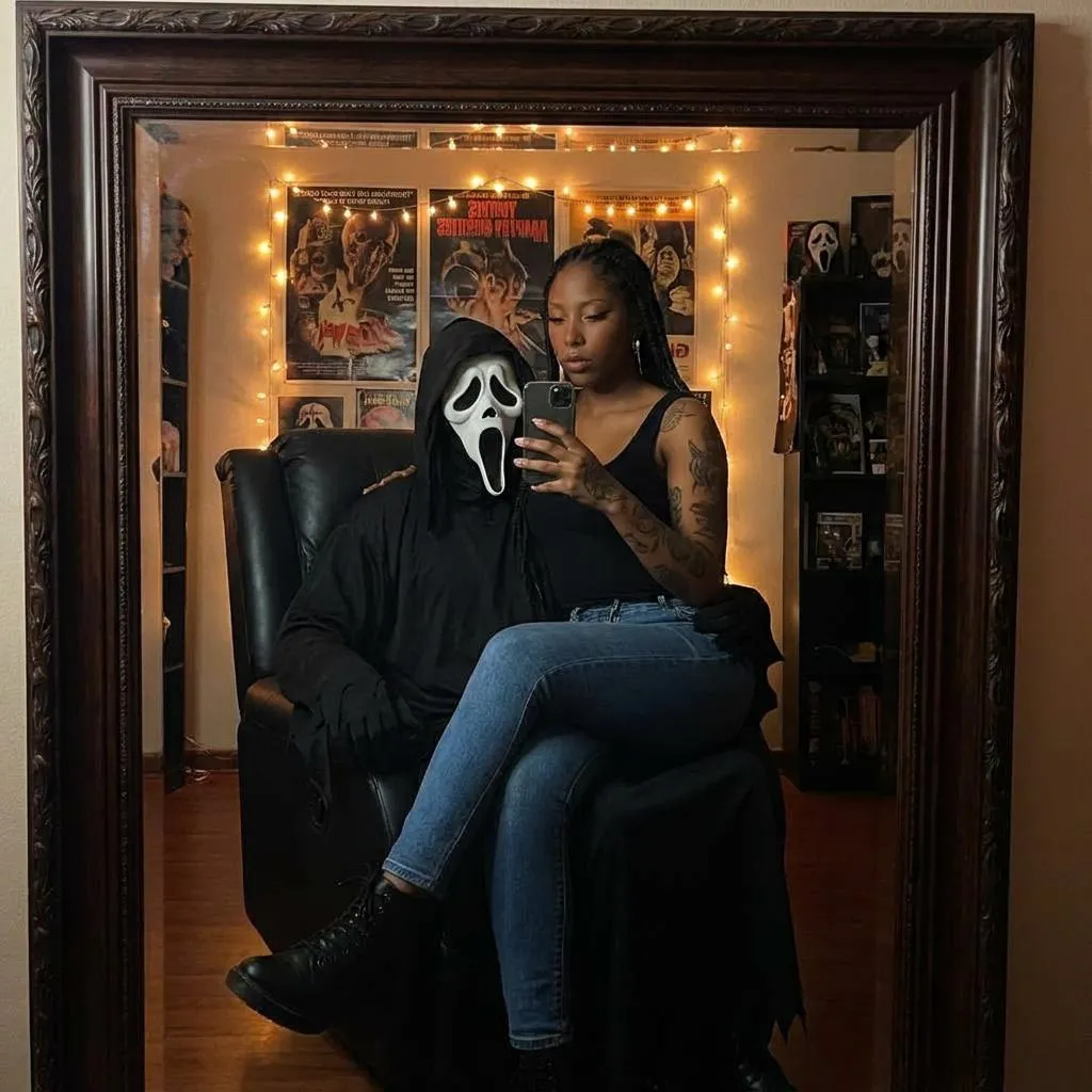 A cinematic indoor horror-inspired scene reflected in a large ornate mirror with dark framing. The same two people from the reference image, keeping identical facial features, hairstyles, and outfits, are sitting together in a cozy dimly lit room. The woman sits on the lap of a figure in a black hooded cloak and white ghost mask, positioned in a large black armchair. She wears a black tank top, blue jeans, and black boots, with visible tattoos on her arms. She holds a phone in one hand, taking a mirror selfie, while the masked figure’s arm rests gently around her waist. The background is decorated with vintage horror movie posters and warm string lights that softly illuminate the dark room. Cinematic lighting, detailed reflections, moody cozy horror aesthetic, 4K ultra-detailed.
