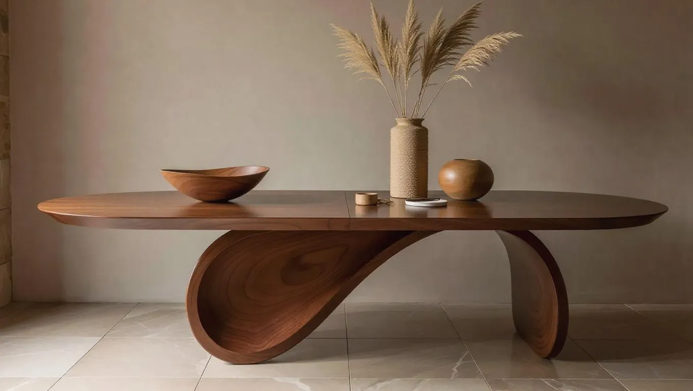 Image showcases a modern, minimalist interior design featuring a uniquely styled wooden table. The table has a smooth, polished surface with a rich, warm brown hue, and its base consists of two sculptural, curved wooden supports that add an artistic flair. On the table, there is a matching wooden bowl with a simple, elegant design. Adjacent to the bowl is a tall, slender vase made of a similar wood, containing dried grasses that add a natural element to the setting. The background is a neutral, textured wall that complements the earthy tones of the furniture. The floor is tiled with large, light-colored tiles that enhance the overall clean and sophisticated aesthetic of the space.