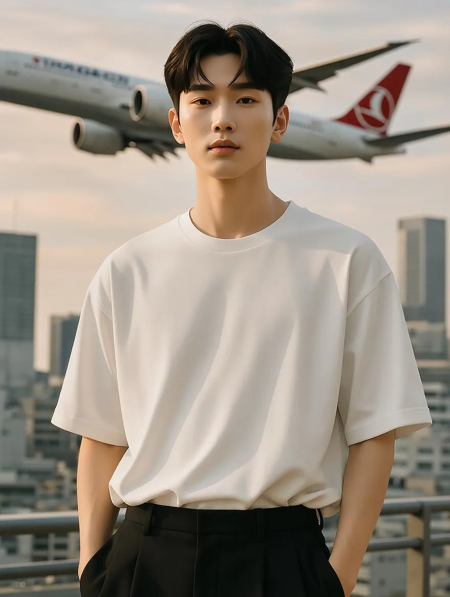 Photorealistic 16:9 portrait of a stylish young Asian male model in Shibuya, Tokyo. He wears an oversized white T-shirt and black wool pants, embodying minimal Korean street style. Clean Korean crop haircut with a soft fringe and tapered sides, natural skin, soft lighting. A Boeing 777 Turkish Airlines jet arcs above the skyline, adding surreal elegance. The background features muted amber and light brown tones. Shot on Sony a7R for Aurelien brand campaign—blending urban calm with refined modern masculinity. Perfect for high-engagement social media fashion visuals.