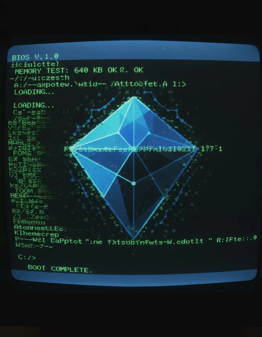Retro CRT computer boot screen that resolves into ASCII-art of [shape or logo]