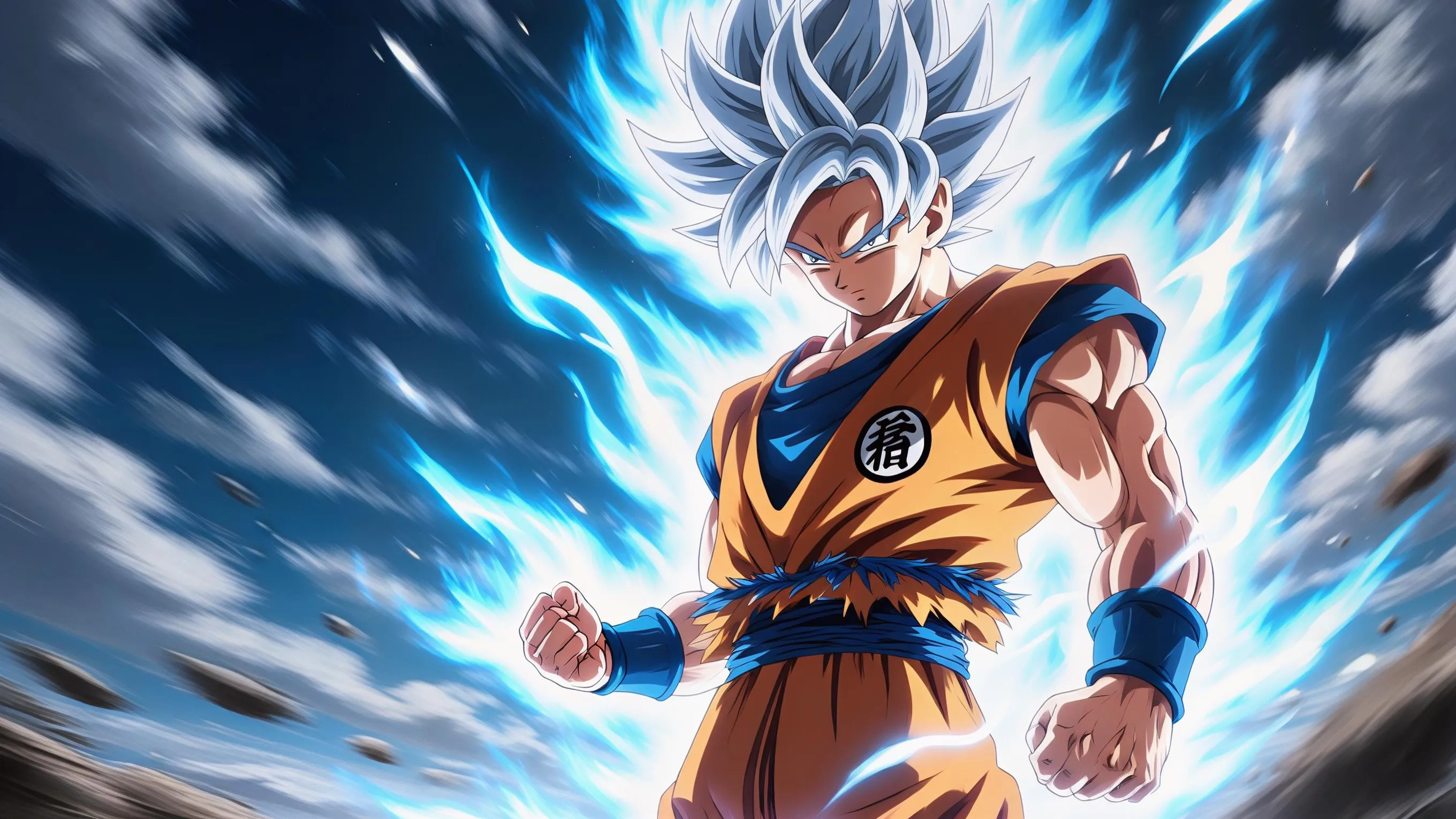 Anime-style illustration of Goku in Ultra Instinct form, silver-white hair glowing, intense calm expression, aura of silver and blue energy swirling around him, dynamic battle-ready pose, motion blur on limbs, vibrant colors, dramatic cloudy sky background, cinematic lighting, highly detailed anime action scene, powerful and serene atmosphere."