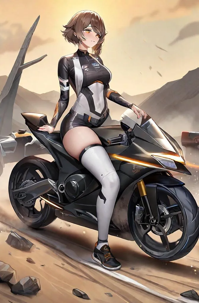 Generate a striking post-apocalyptic AI scene with a weathered android Mural Girl on a cracked highway, draped in nomadic textiles and scavenged tech. Harsh sunlight highlights textures, ruins, and a robotic sport-bike. Vivago.ai crafts lifelike dystopian visuals using rule of thirds, leading lines, and desolate landscapes for professional-grade AI art.