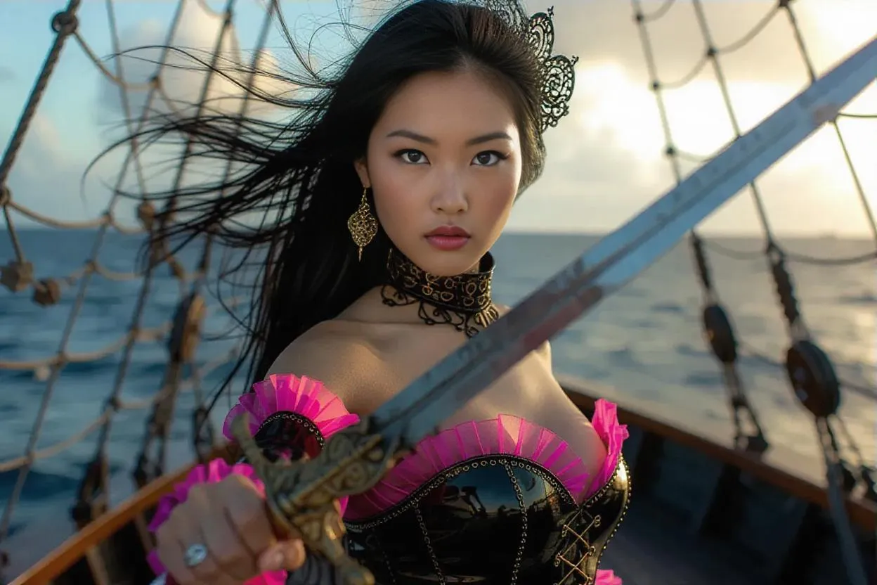 Generate a steampunk-inspired Asian warrior with long black hair, wielding a golden-ornamented sword aboard a pirate ship. AI-powered tools craft realistic details: wind-blown hair, intricate steampunk attire, pink accents, and seaside backdrops. Elevate your fantasy art with precision. Create with vivago.ai.