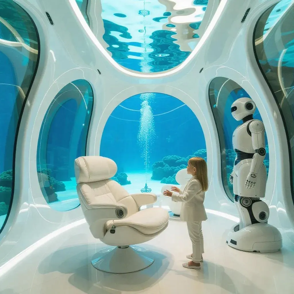 Create AI-generated futuristic underwater scenes with transparent glass walls and minimalist decor. Visualize blonde children in business attire interacting with multi-tiered AI robot servants through Vivago.ai's advanced image generation. Perfect for conceptualizing curved architecture, modern office chairs, and immersive aquatic environments in crisp white/cream tones.