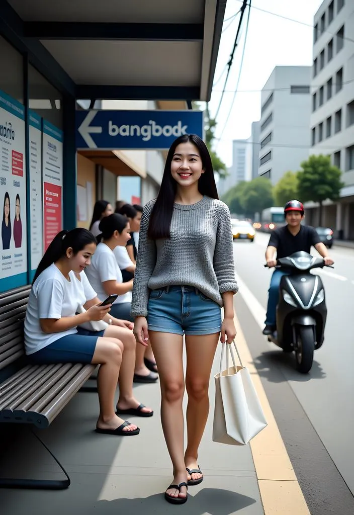 Create a vibrant Bangkok bus stop scene with vivago.ai: AI-generated image of Thai woman Sora in trendy knitwear and shorts carrying bags amidst bustling urban life. Features people, traffic, tuk-tuks, and city architecture for authentic street photography. Generate stunning visuals from text prompts.