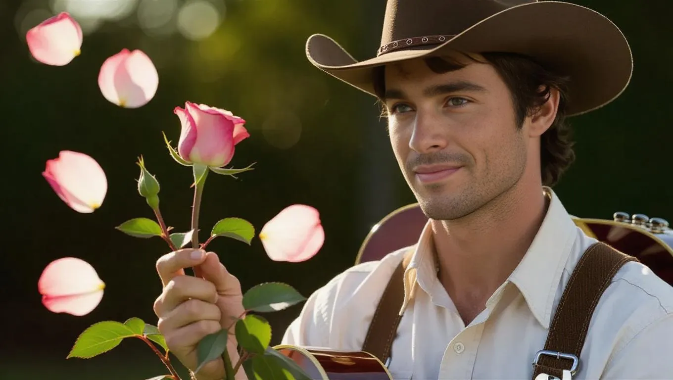 **Prompt:** A close-up of a single flower bud as it begins to bloom in slow motion. Camera rotates around it while a male hand gently touches a rose. Petals begin to float in the air. **Characters:** **Male Character:** A young romantic cowboy, mid-20s, with sun-kissed skin, soft hazel eyes, and short curly dark brown hair. He wears a white button-up shirt, tan suspenders, and a wide brown cowboy hat. He has light stubble and a gentle smile. Slim but strong build. Always carries a guitar on his back. **Mood:** magical, symbolic, glowing sunlight, soft wind