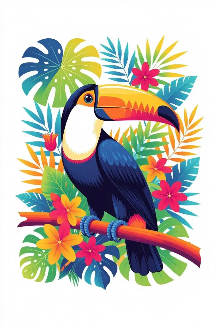 Generate vibrant, abstract AI toucan art in lush tropical habitats. Transform text prompts into vivid visuals of exotic birds, tropical trees, fruits, and flowers with professional-grade AI tools. Create surreal, colorful ecosystems for creative projects or digital art.
