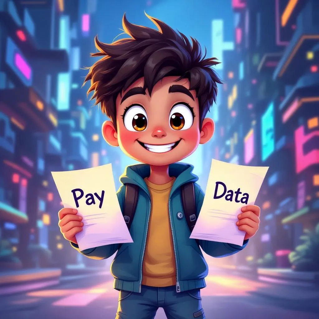 Create this AI-generated cartoon boy half-length portrait with symbolic papers: one says 'Pay' in left hand, one 'Data' in right. Design unique AI illustrations on VIVAGO using text-to-image prompts. Explore custom cartoon generation and AI art tools for expressive results.