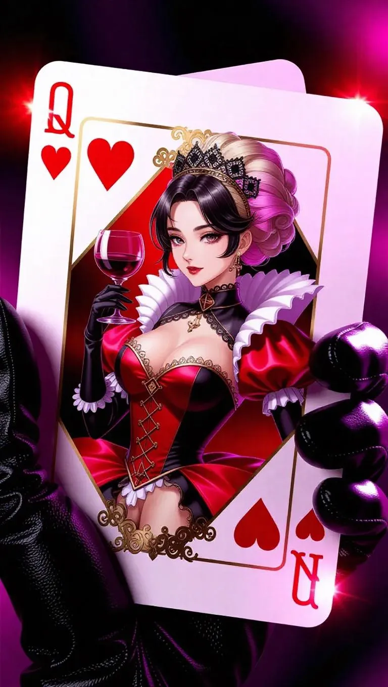 A glossy 3D anime playing card featuring Rosé (singer) as the Queen of Hearts, resting on an open palm in a black leather glove. The card features an anime style portrait of Rosé in a red and black royal dress, holding a glass of wine, with pink and blonde hair topped with black lace. Hyper detailed with a gold edged frame, Q♥ symbols, and glowing text that reads "Rose is the Queen of Hearts". The glove has a rich leather texture that softly reflects the light. Dark, blurred background for cinematic depth. Fantasy elegance, hyper detailed, high contrast, close-up.