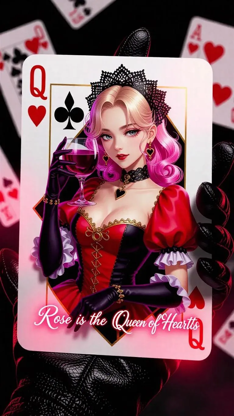 A glossy 3D anime playing card featuring Rosé (singer) as the Queen of Hearts, resting on an open palm in a black leather glove. The card features an anime style portrait of Rosé in a red and black royal dress, holding a glass of wine, with pink and blonde hair topped with black lace. Hyper detailed with a gold edged frame, Q♥ symbols, and glowing text that reads "Rose is the Queen of Hearts". The glove has a rich leather texture that softly reflects the light. Dark, blurred background for cinematic depth. Fantasy elegance, hyper detailed, high contrast, close-up.
