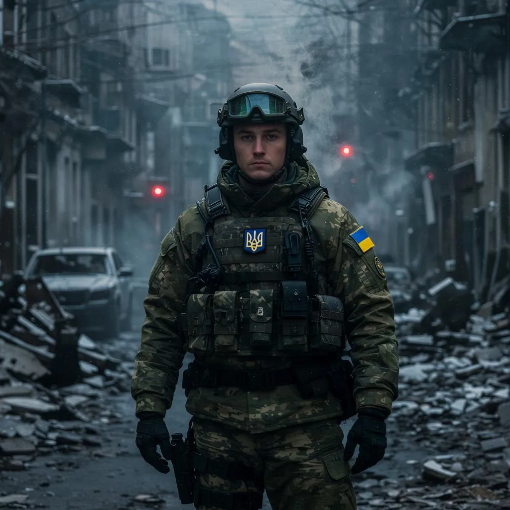 AI-generated military art: Ukrainian special ops soldier in tactical gear stands resolute on war-torn urban street, blue-yellow flag patch visible. Hyper-realistic cinematic visuals with cold steel tones, night vision gear, and smoky dystopian backdrop. Experience immersive military psy-ops aesthetics with VivaGo AI's dark drill-inspired image generator for intense, judgment-filled warfare scenes. Cinematic camera movement enhances tension.