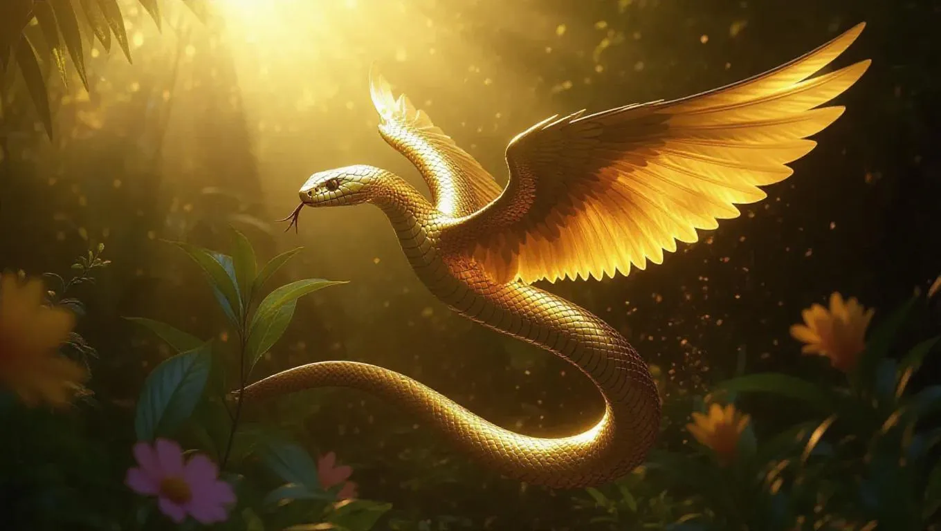 Generate a majestic winged golden snake in flight with AI-powered precision. Create mythical serpent art, dynamic rising visuals, and ethereal golden reptile designs using advanced AI image tools. Craft stunning, high-quality fantasy scenes from text prompts for professional-grade mythical creature artwork.