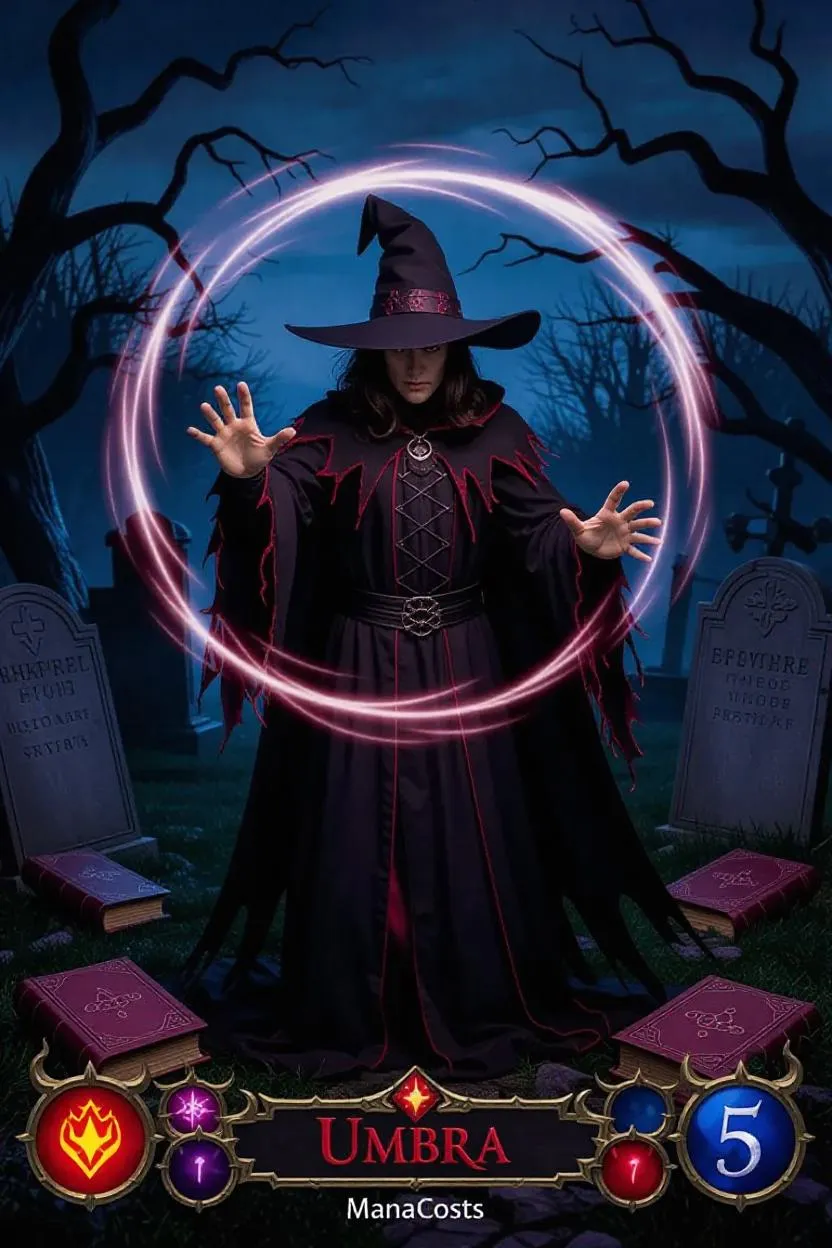 A dark sorcerer summoning a swirling vortex of eerie, ethereal energy, wearing tattered black robes with crimson lining and a pointed hat, standing amidst a haunted, mist-shrouded graveyard at dusk, with crumbling headstones and twisted, gnarled trees looming in the background, as a faint, pulsating glow emanates from ancient tomes scattered around, displaying the card's rarity as 'Legendary', faction symbol 'Umbra' emblazoned on the sorcerer's cloak in blood-red, and a mana cost of 5 dark, glowing orbs hovering above his outstretched hand.