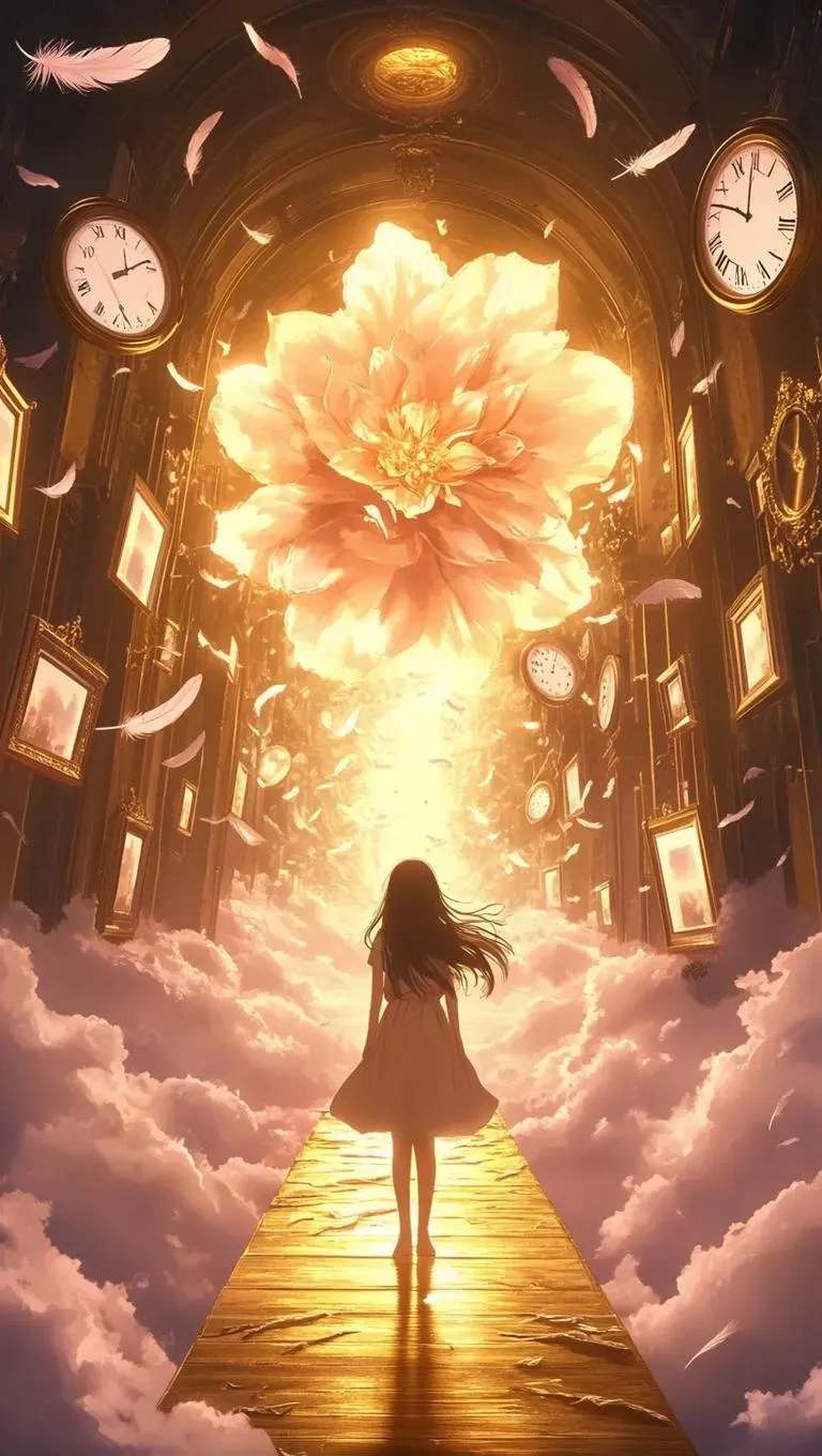 An endless golden-lit hallway floats above drifting clouds, lined with broken clocks, feathers, and floating photo frames. At the end, a glowing, blooming flower-shaped doorway beckons. A girl stands alone, her back to the viewer, hair flowing in the wind. Cinematic anime lighting bathes the scene in a golden-pink hue, creating a deeply symbolic and tranquil atmosphere.