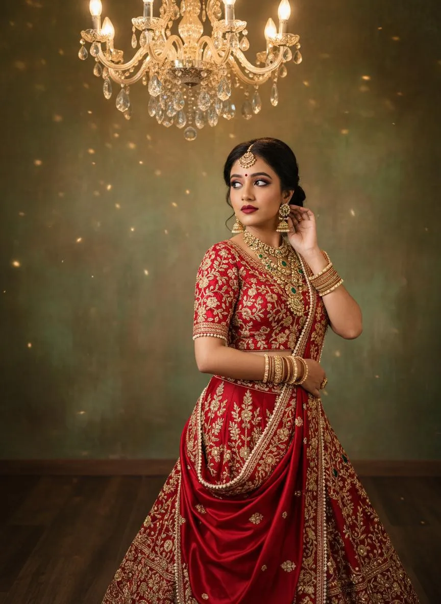 The identity of the uploaded portrait is strictly preserved (retaining facial contours, authentic Indian skin tone, hairstyle and age). This is an upper-body portrait with a 3:4 aspect ratio, capturing her facial features with sharp clarity. The subject is an elegant and opulent Indian woman with exquisite makeup: deep defined eye makeup paired with a matte true red lip, and a red bindi adorned on her forehead. Her hair is styled into a graceful updo, with a golden maang tikka inlaid with micro-diamonds and pearls resting on her forehead. She is dressed in a luxurious traditional Indian red Lehenga Choli: the blouse is a slim-fit short-sleeve style fully embellished with intricate golden heavy hand-embroidery and inlaid with emeralds; the flared long skirt is crafted from red satin, entirely covered with elaborate golden vine and floral embroidery and edged with a delicate white beaded trim. A matching red dupatta is draped elegantly over her shoulders and arms. Around her neck, she wears stacked ornate necklaces encrusted with emeralds and gold ornaments, with openwork carved gold earrings at her ears and multiple layers of golden bangles and bracelets adorning her hands. She strikes an elegant pose, turning her head back in a side profile, one hand gently touching her earring and the other resting on her waist. The skirt drapes and spreads naturally, exuding a classical and gentle sense of movement. The background features a retro weathered art paint wall with a green-brown gradient, with a large crystal chandelier hanging overhead; warm golden light refracts through the crystal to cast soft light spots, and the floor is finished with dark matte wood. Professional portrait lighting is employed: a warm-toned key light illuminates her entire body, while fill light defines her contours, highlighting the luster of the garment’s embroidery and the translucent texture of the jewelry. The style is a retro palace-inspired Indian wedding portrait, boasting ultra-high definition and delicate details, rich and saturated colors, and creating an atmosphere of luxury and elegance.
