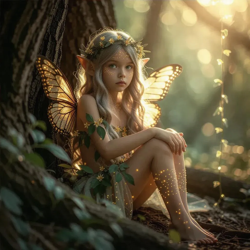 Create a mystical woodland fairy with AI: serene fairy seated under an ancient tree, adorned in floral-leaf attire, glowing golden patterns, and translucent butterfly wings. Holding a luminous vessel amidst enchanted orange blossoms. Craft magical forest scenes with vivago.ai's text-to-image tools for vivid details, ethereal lighting, and nature-inspired fantasy art.