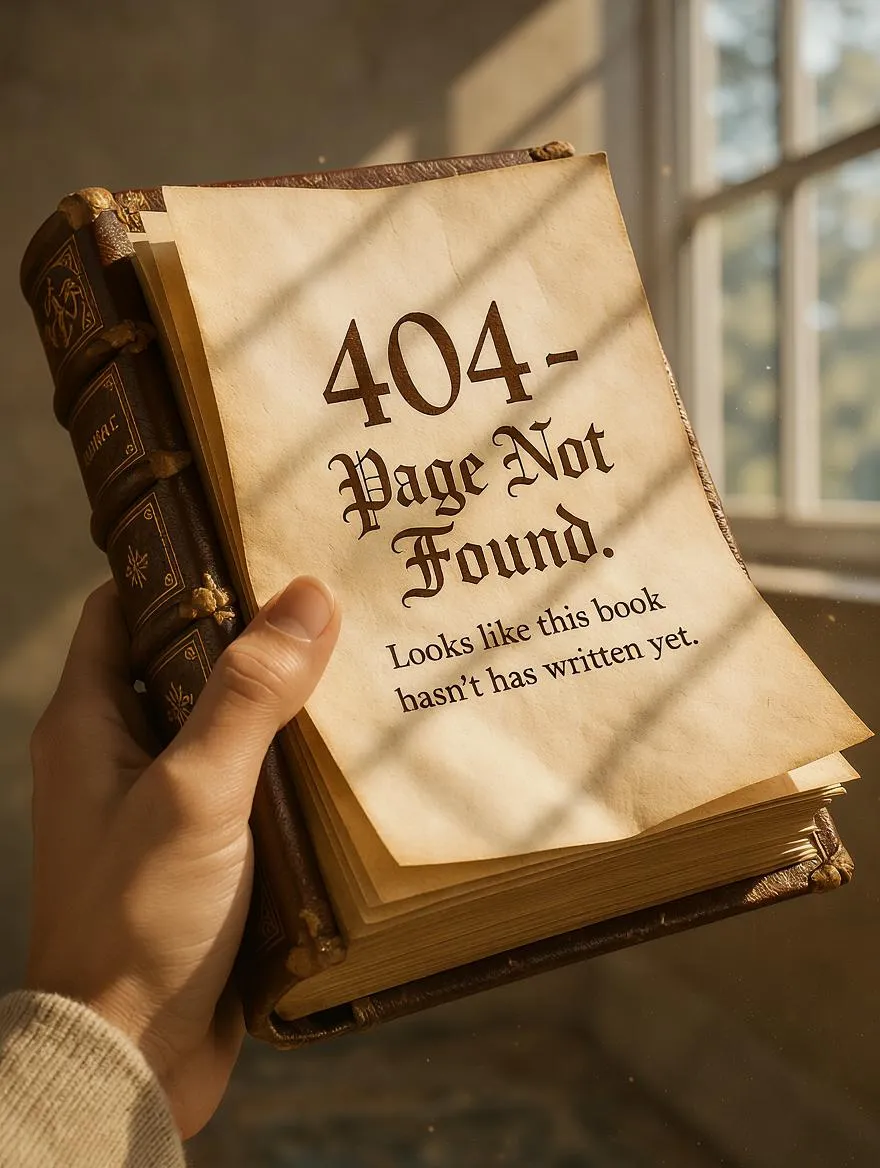 A hyper-realistic animated scene (800×600) features a floating, leather-bound antique book with ornate gold embossing against a transparent background. A human hand enters frame, gently flipping through thick, textured parchment pages that cast delicate, shifting shadows. The pages flutter naturally until the final spread, where a refined message in deep brown calligraphic serif (Georgia/Baskerville) reads, “404 – Page Not Found,” followed by, “Looks like this book hasn’t been written yet.” Soft afternoon sunlight enhances the timeless, quietly magical atmosphere, with fine details like leather grain, page fibers, and dust motes.