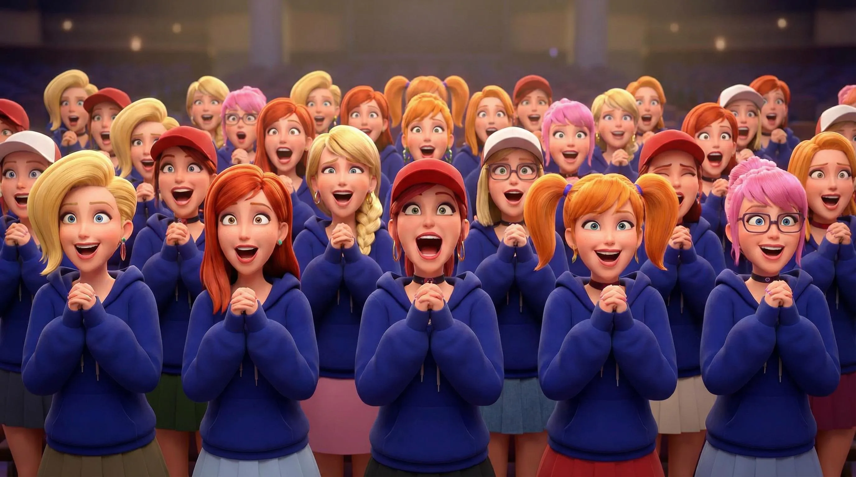 Create anime-inspired CGI crowds with Final Fantasy hairstyles in deep blue hoodies featuring moe sleeves hiding praying hands. Vibrant accessories like baseball hats, chokers, and colored nails. Generate diverse characters with elated expressions, side-swept hair, and unique sleeve styles using this AI image generator for vivid fan art scenes.