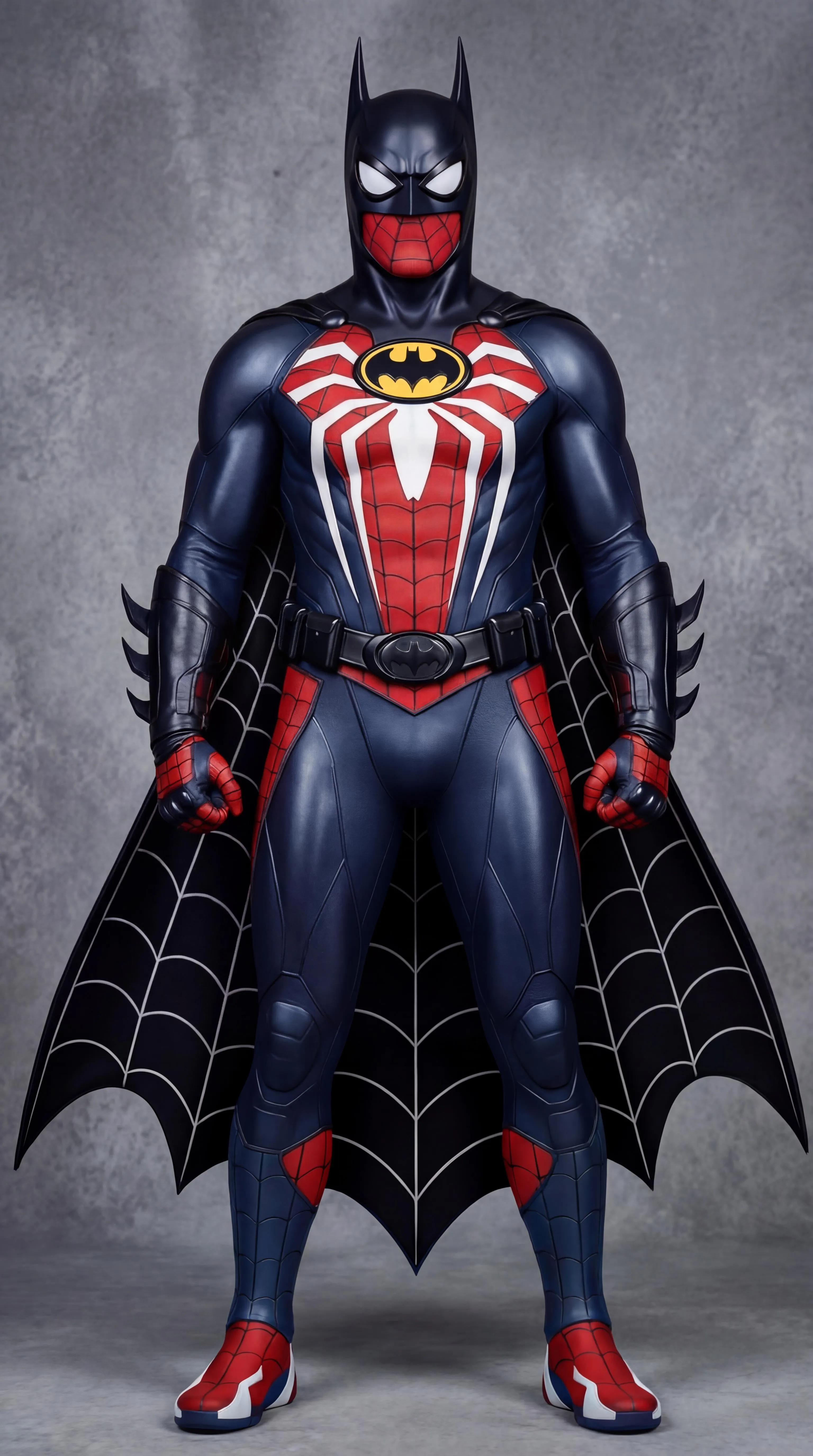 The Insomniac Spider-Man (voiced by Yuri Lowenthal) and Batman (portrayed by Michael Keaton, Val Kilmer, and George Clooney) interchangeably combine into each other as one to become Spider-Bat. The eye slits on Spider-Man's masks are in place of the eye holes on Batman's masks. The mouthpieces of Batman's masks are replaced by the lower parts of Spider-Man's masks. The front spider logos on Spider-Man's two suits are combined and merged with the front bat logos on Batman's two suits as one to form a spider-bat logo on the chest of the shirt. Batman's cape is instead split underneath his suit's arm pits like bat wings with white spider webs like Spider-Man's makeshift web wings. The utility belts on Batman's suits are combined and included. Spider-Man's shirts come with Batman's gloves. Batman's pants come with Spider-Man's boots.